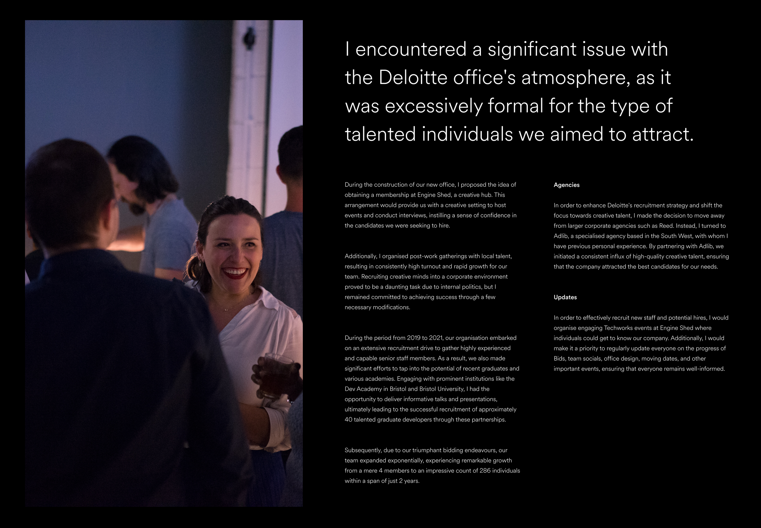 In order to enhance Deloitte's recruitment strategy and shift the focus towards creative talent, I made the decision to move away from larger corporate agencies such as Reed. Instead, I turned to Adlib, a specialised agency based in the South West, with whom I have previous personal experience. By partnering with Adlib, we initiated a consistent influx of high-quality creative talent, ensuring that the company attracted the best candidates for our needs.